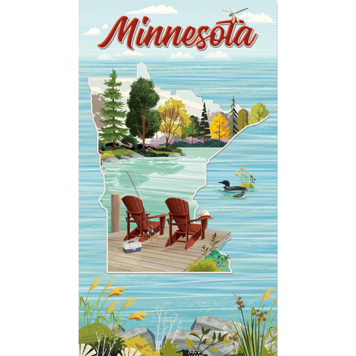26 availableThis beautiful Quilt Minnesota panel by Tim Chapman showcases the beautiful scenery of MN including loons and a peaceful fishing dock! 24" by 42"-44"